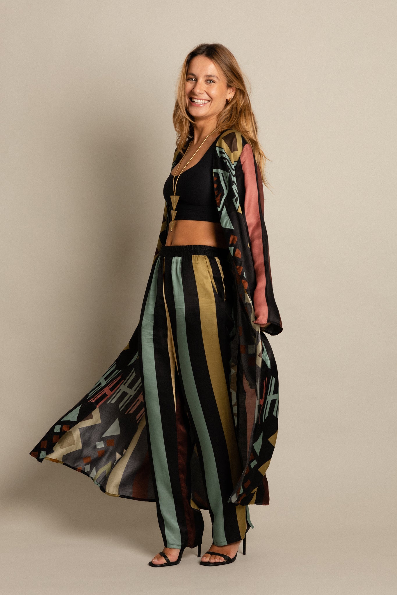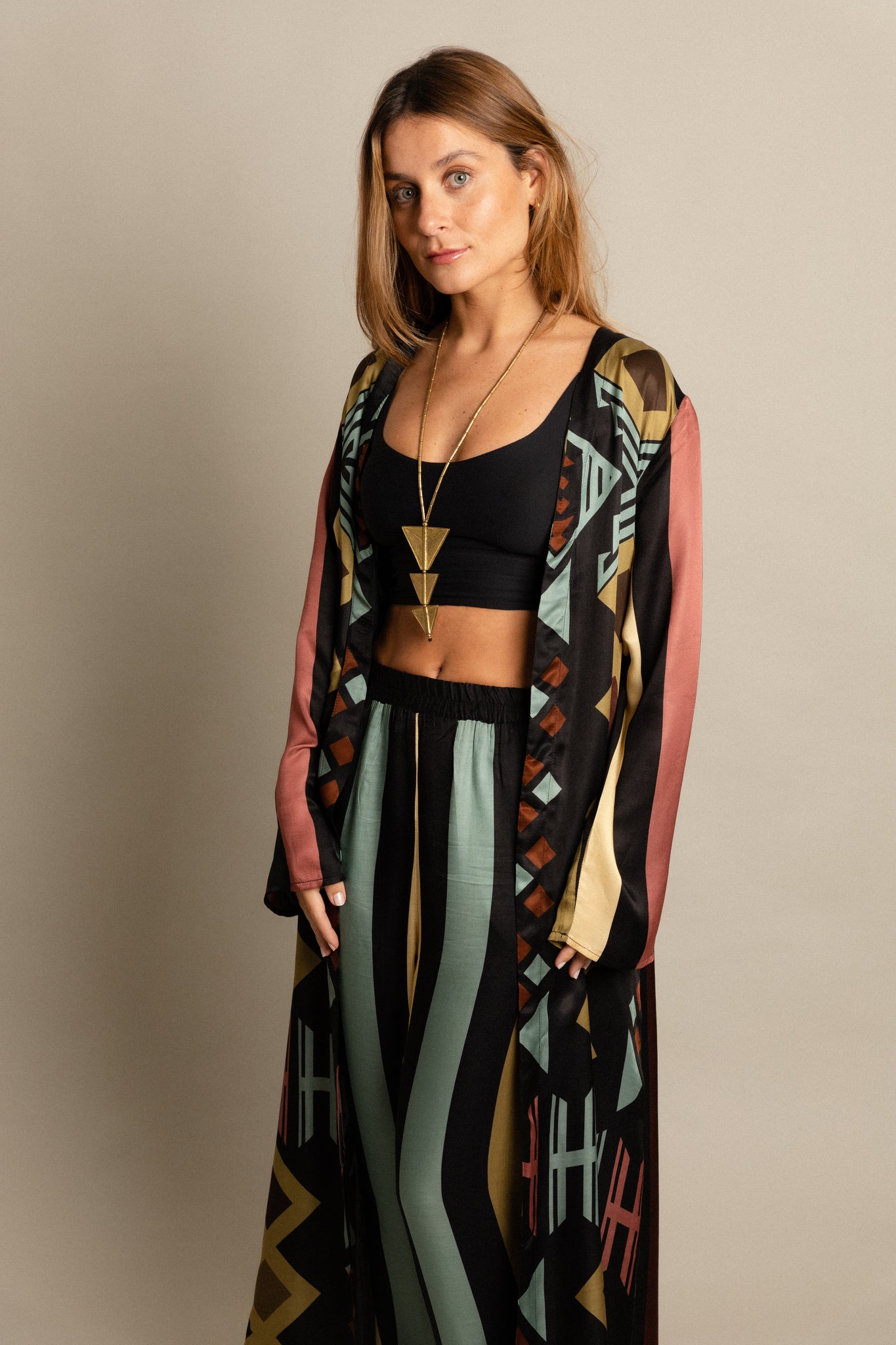 Invite a layer of artisanal luxury into your wardrobe with this striking statement piece. The Bazaruto Kimono in black multi features a bold, geometric tribal-inspired motif, designed for the woman who seeks a fusion of cultural art and modern, effortless style.