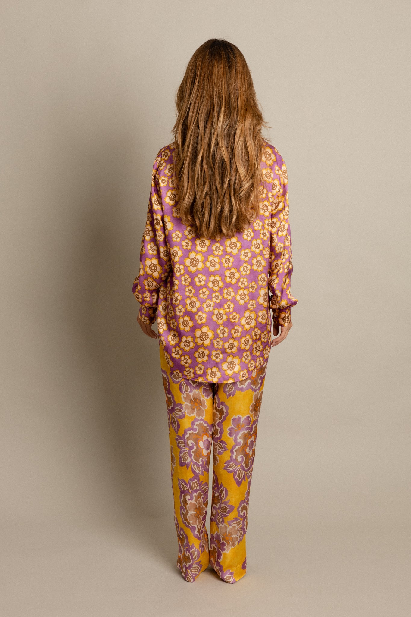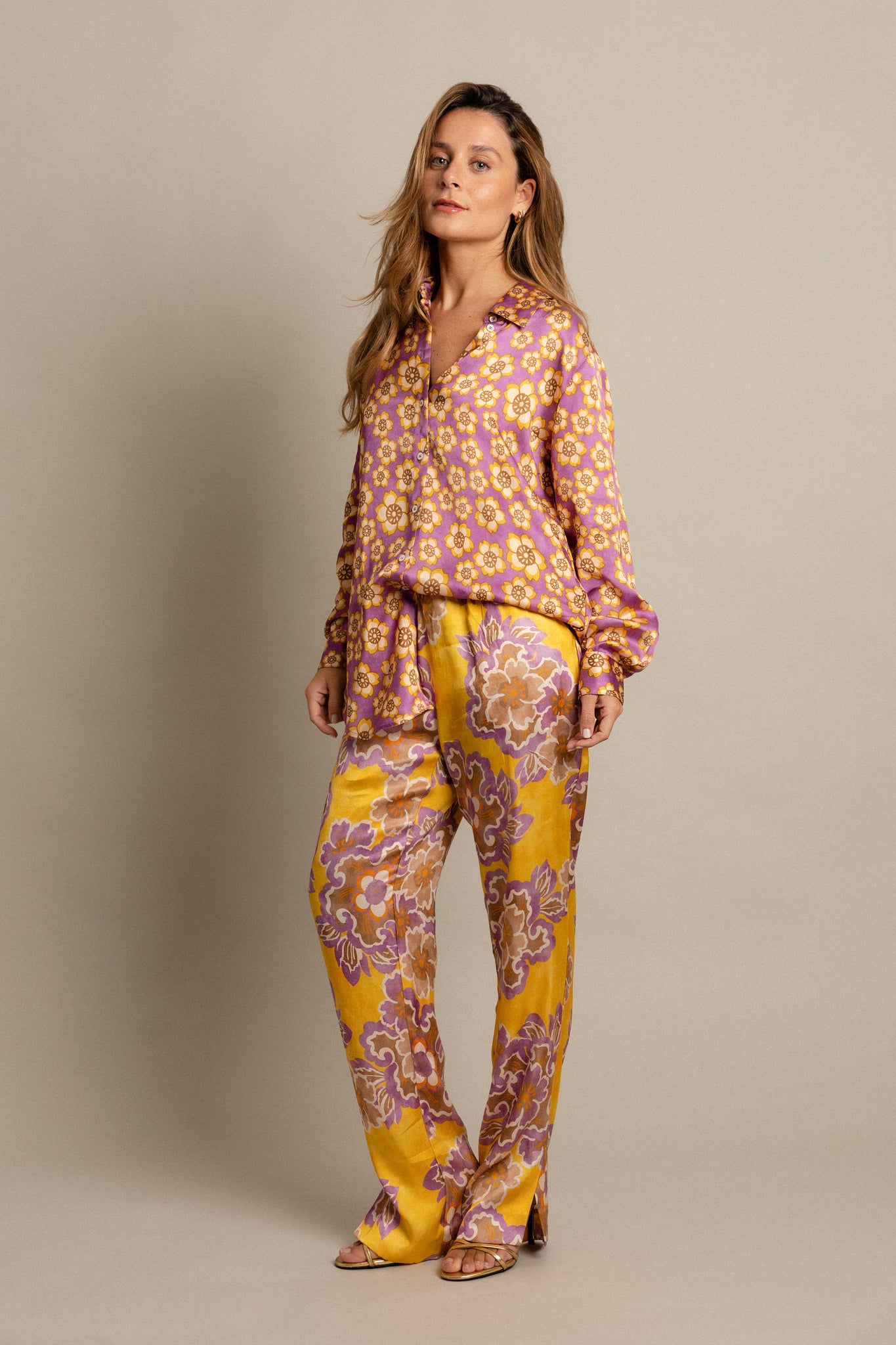 Embrace effortless movement and artistic comfort with these striking statement pants. The Córsega Trousers feature an ornate, multi-tonal floral motif in yellow and lilac, designed to create a bold, elongated silhouette with a refined aesthetic.