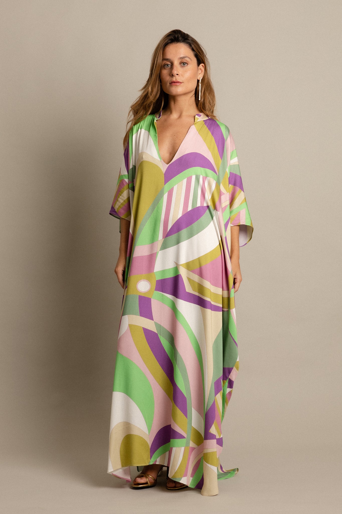 Invite a burst of vibrant energy into your collection with this captivating statement piece. Our Retro Swirl Maxi Kaftan features an eclectic mix of lime, lilac, and forest green in a dynamic, sweeping pattern designed for the woman who loves to stand out with artistic flair.