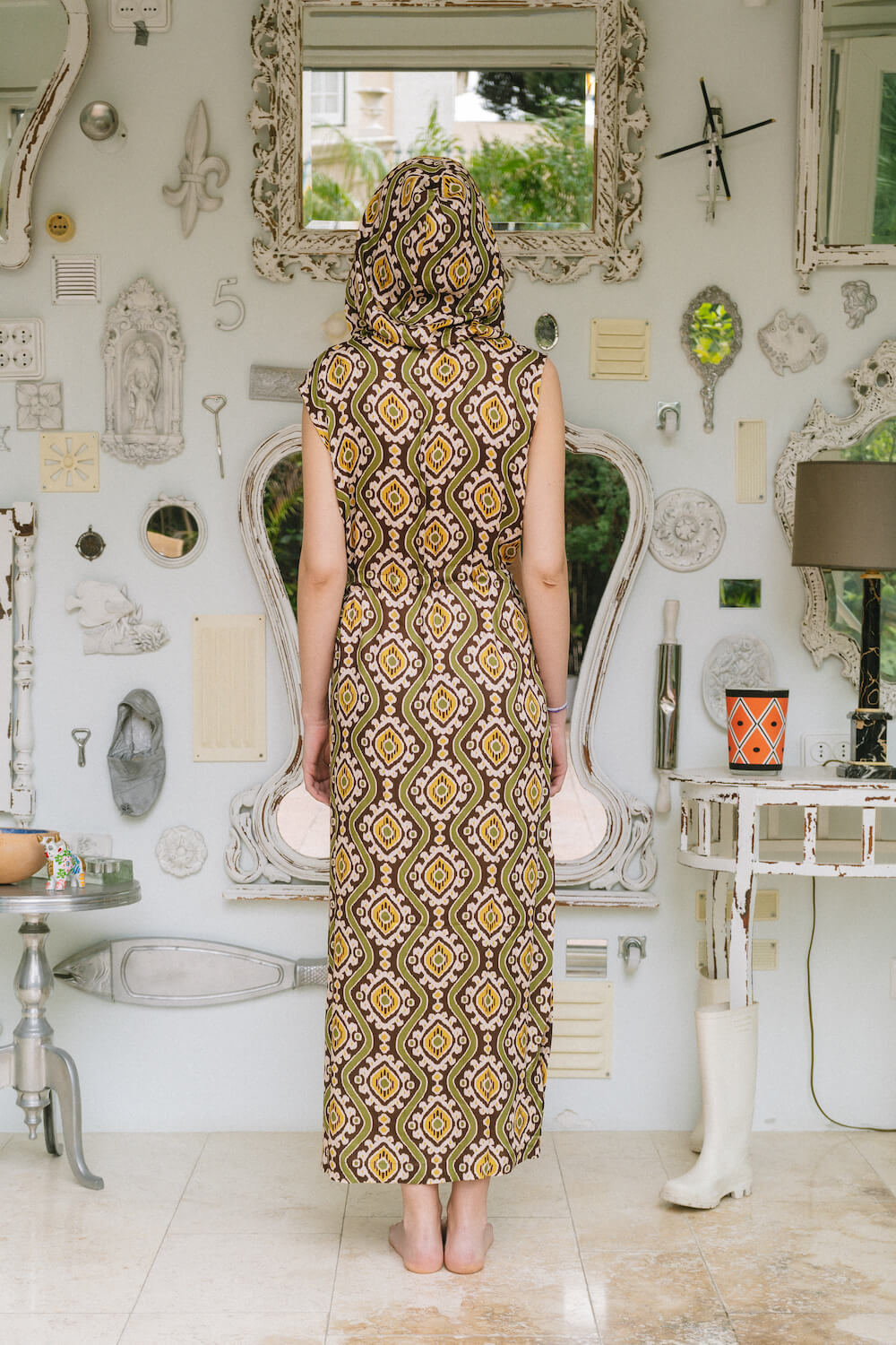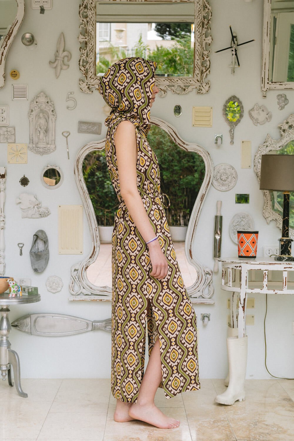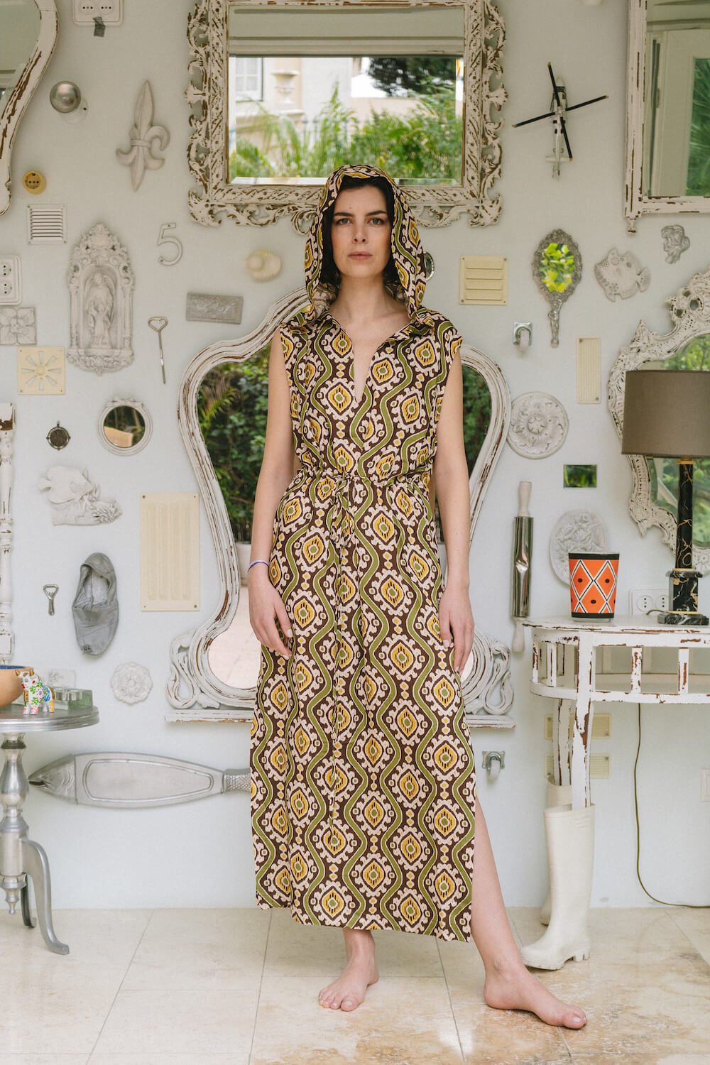 Long dress with pockets, cord in the waist and hood .